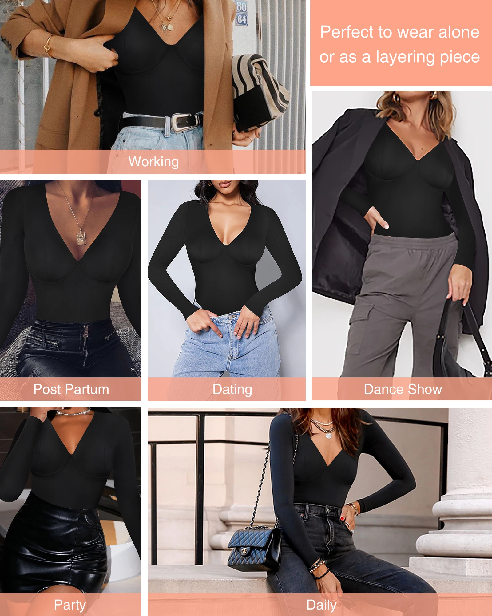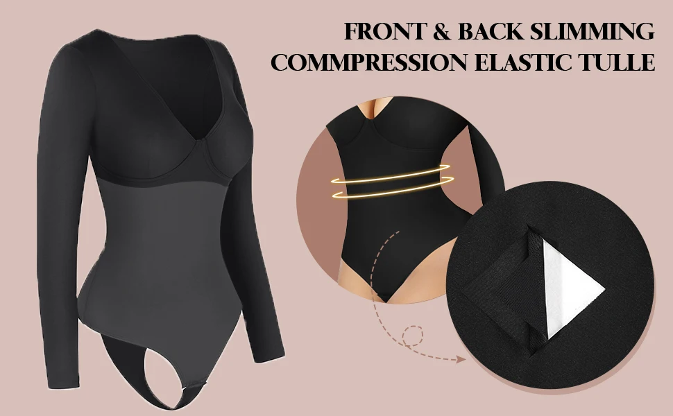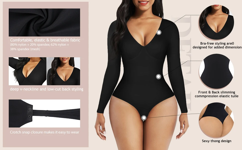 - High Waist Tummy Control Thong Bodysuit – V-Neck Long Sleeve