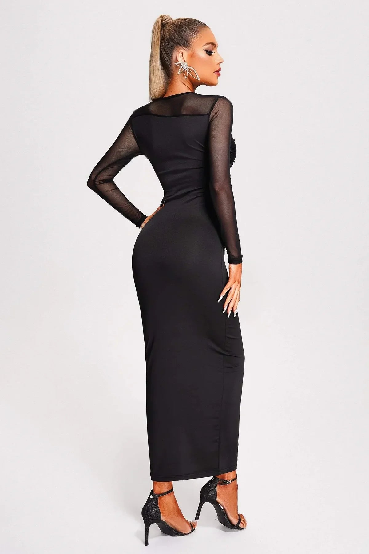 The Taylor Maxi Dress is a sleek, form-fitting black dress with long sleeves. It combines style and comfort for a confident, elegant look.