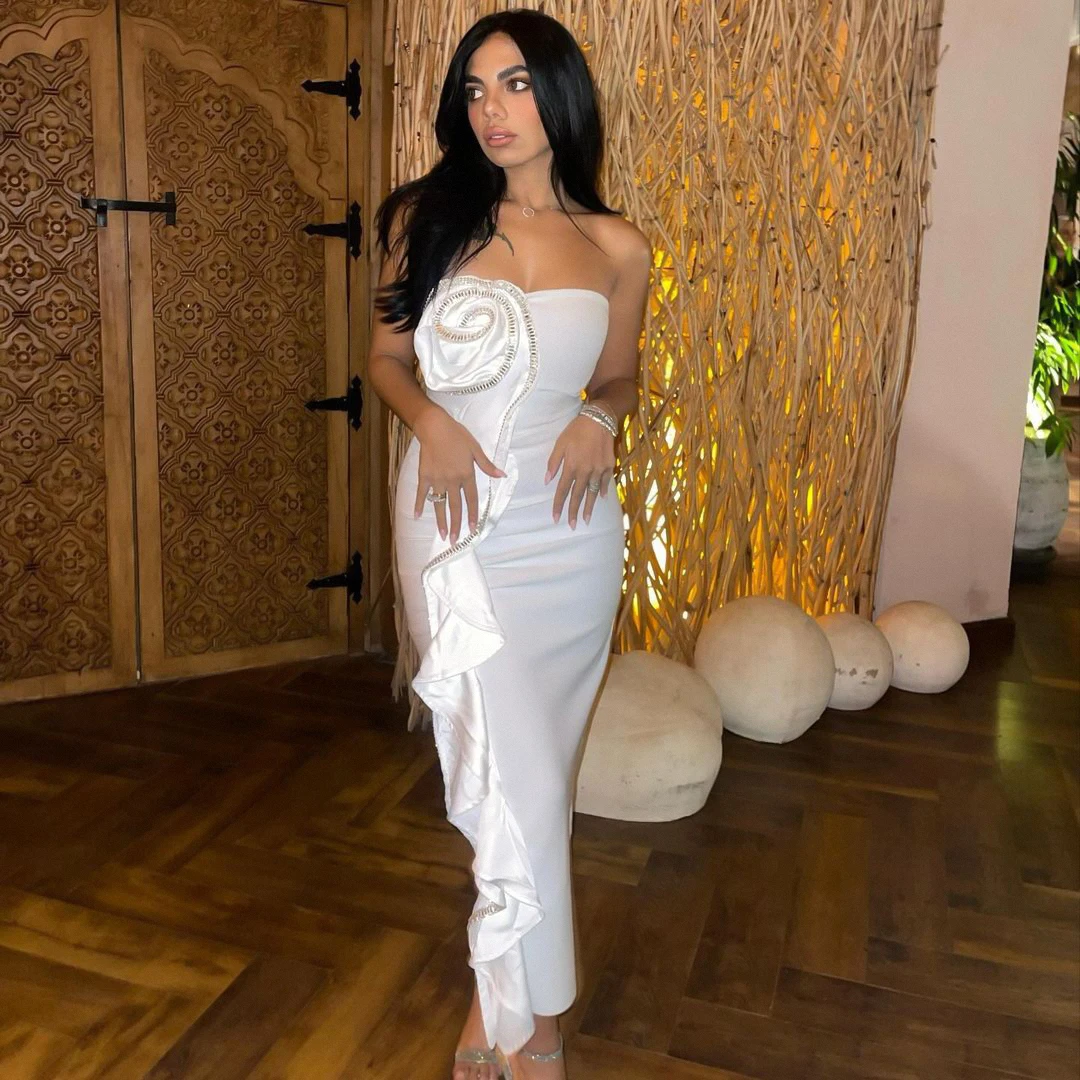 • Woman wearing a white strapless dress with ruffle details on a white background