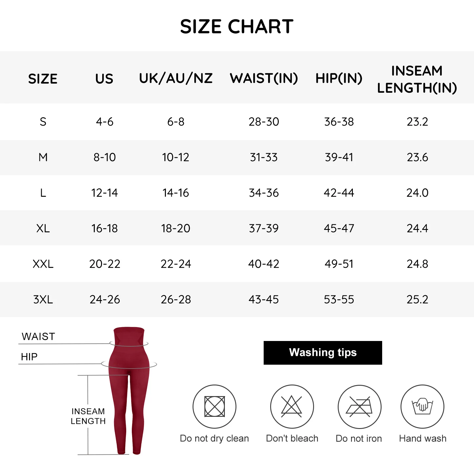 | Size | Bust (inches) | Waist (inches) | Hips (inches) |