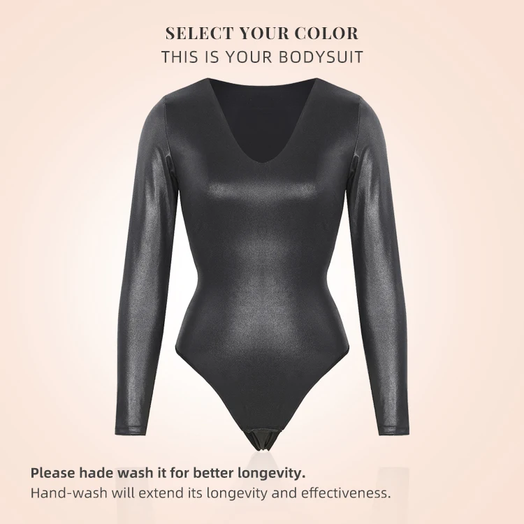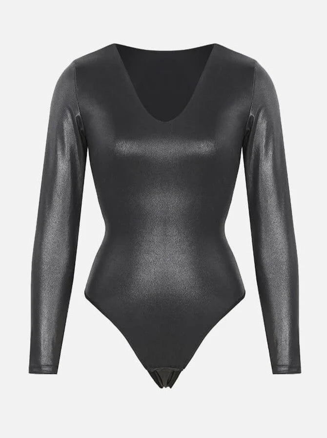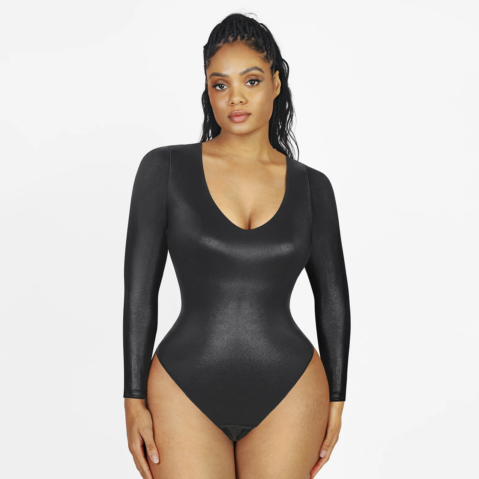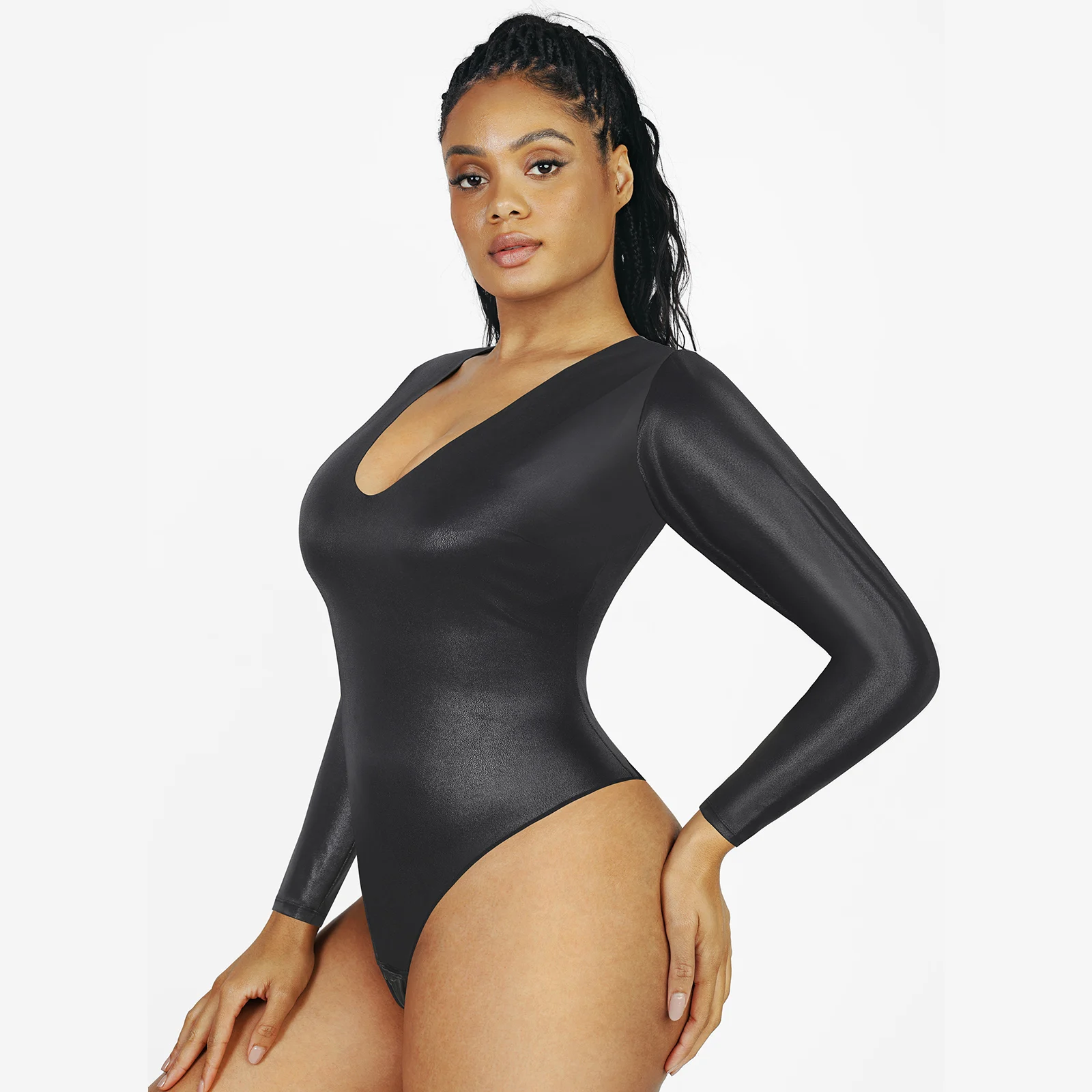Slimming V-Neck Thong Bodysuit – Long Sleeve, High Elastic
