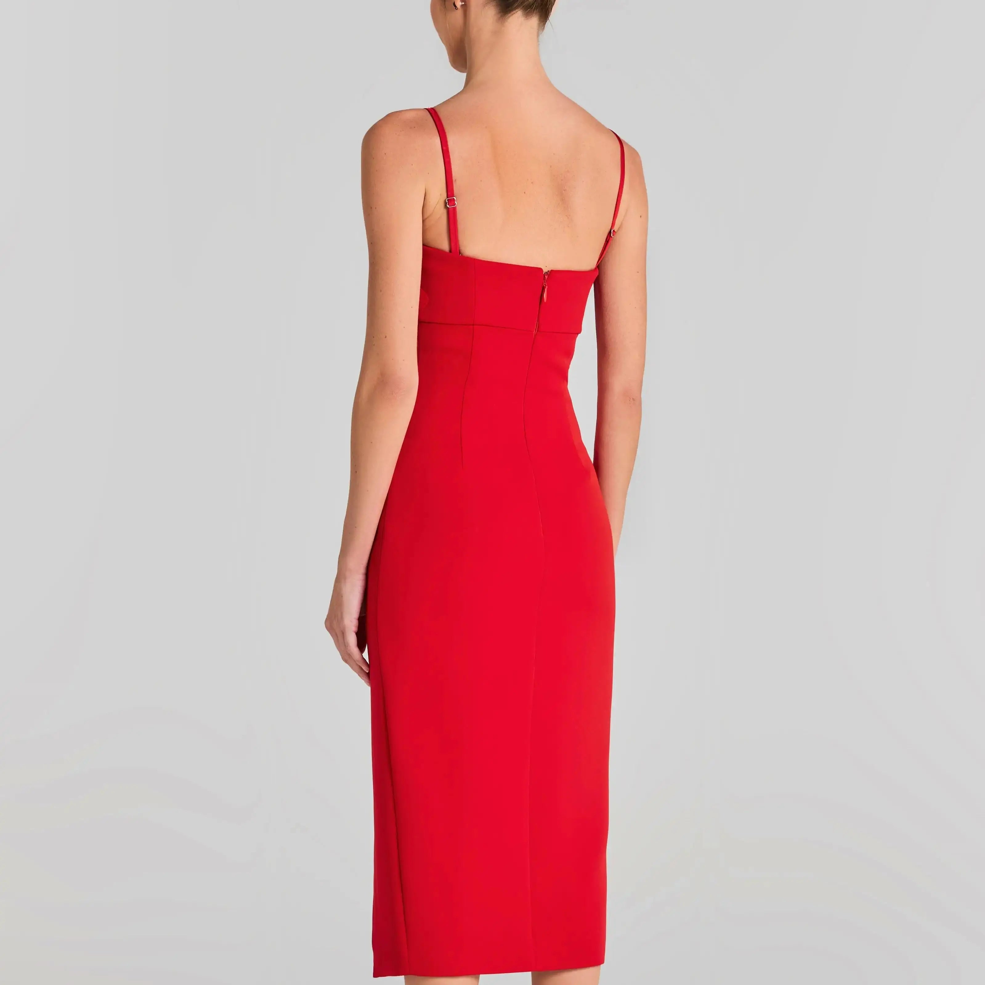 Make a statement in this red floral bodycon midi dress featuring thin straps and a side slit. Its curve-hugging fit and lively pattern add a playful, flirty vibe, ideal for summer nights or stylish events.