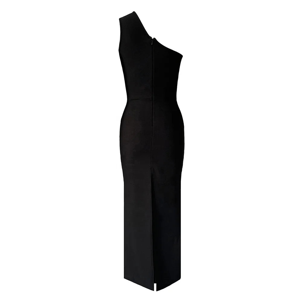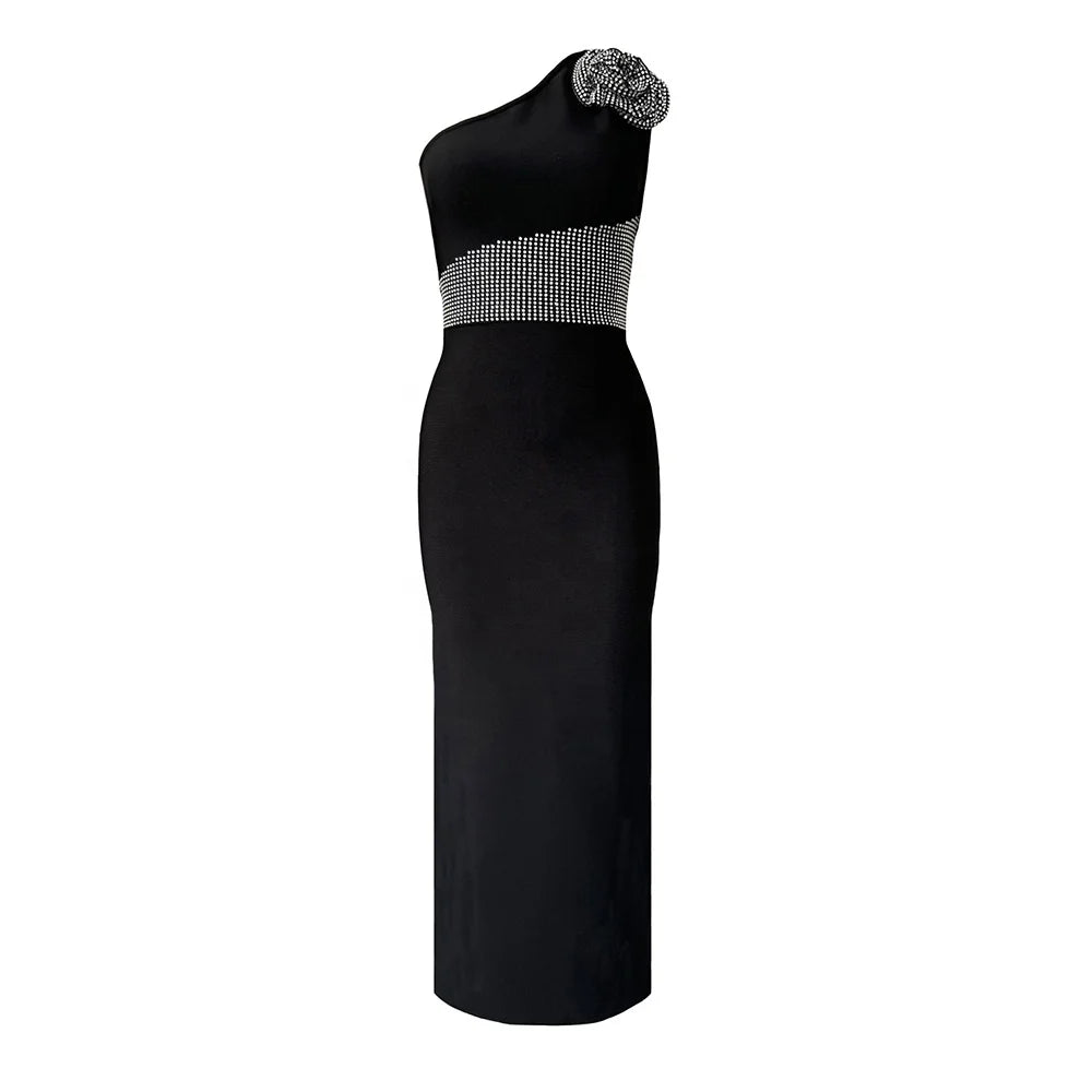 The Alana Monteiro Maxi Dress features a one-shoulder fit with sparkling rhinestone flowers. Its bandage style shapes your figure, great for parties and events.