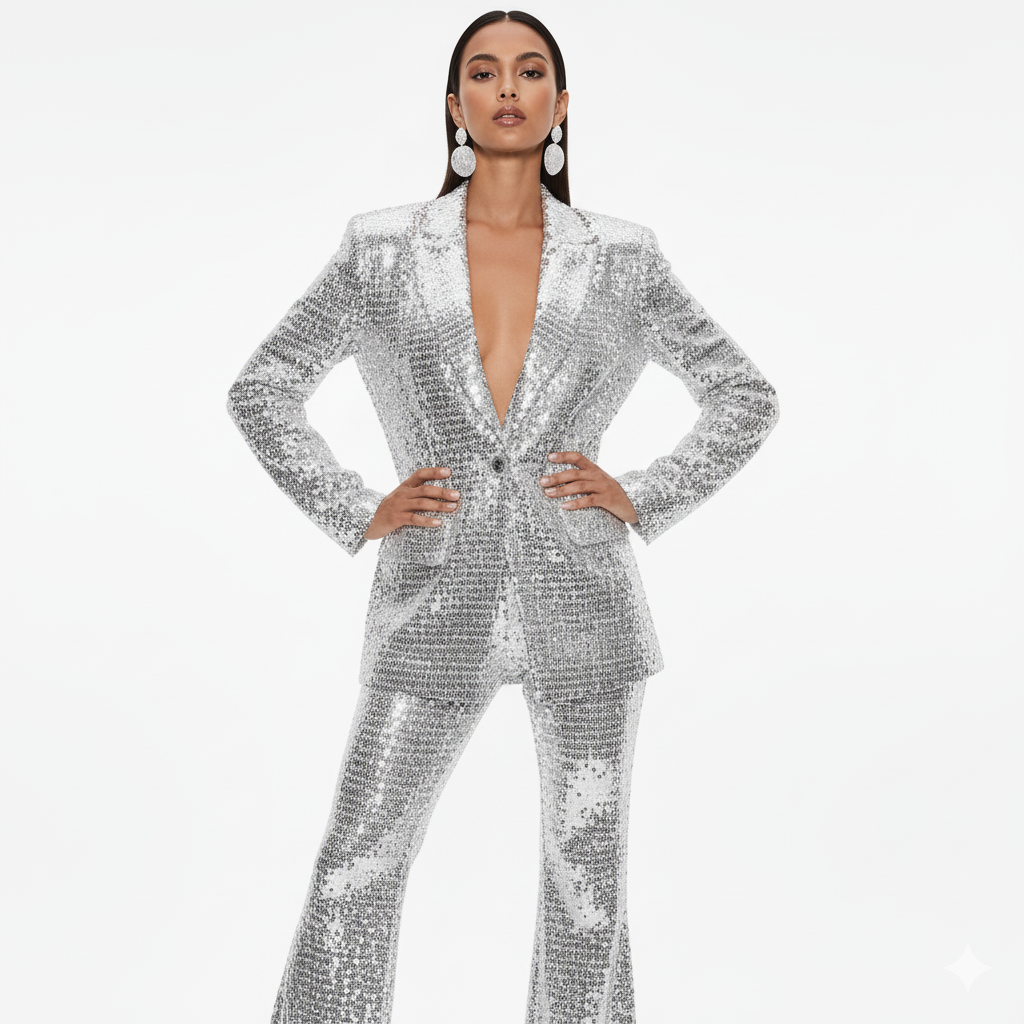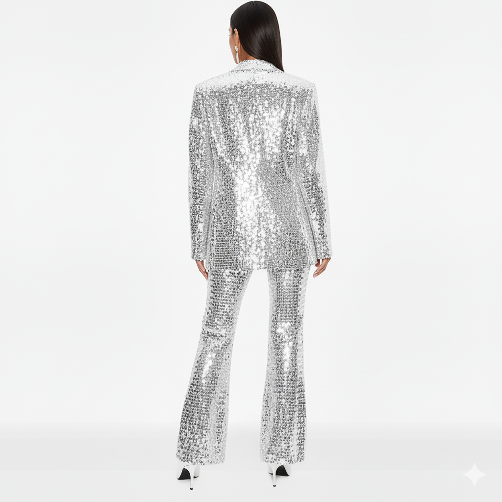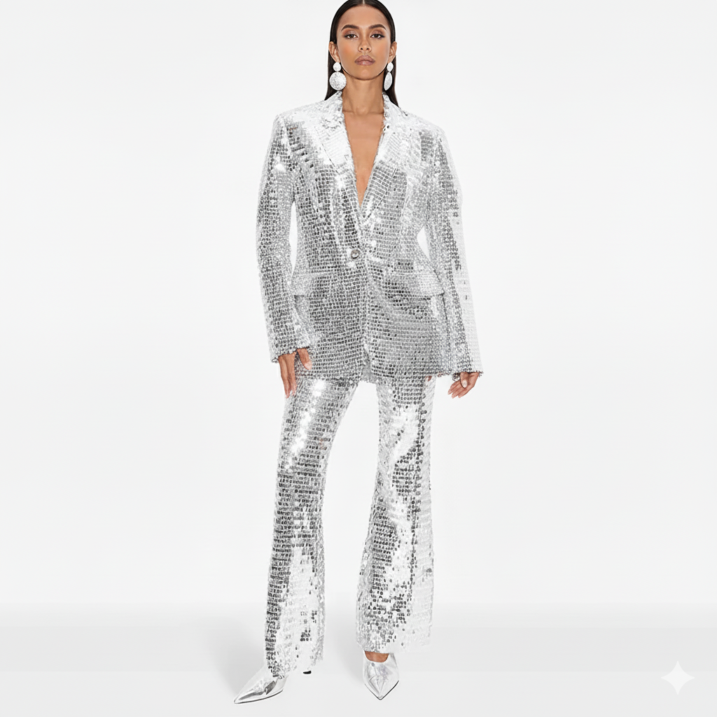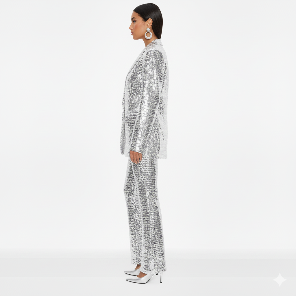This elegant two-piece set features a tailored blazer and matching pants, creating a polished look perfect for work or formal events. The sleek design ensures a sophisticated and confident style.