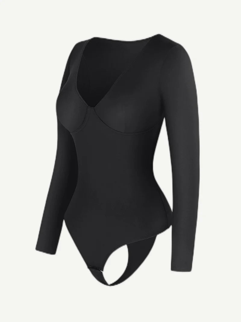 High Waist Tummy Control Thong Bodysuit – V-Neck Long Sleeve
