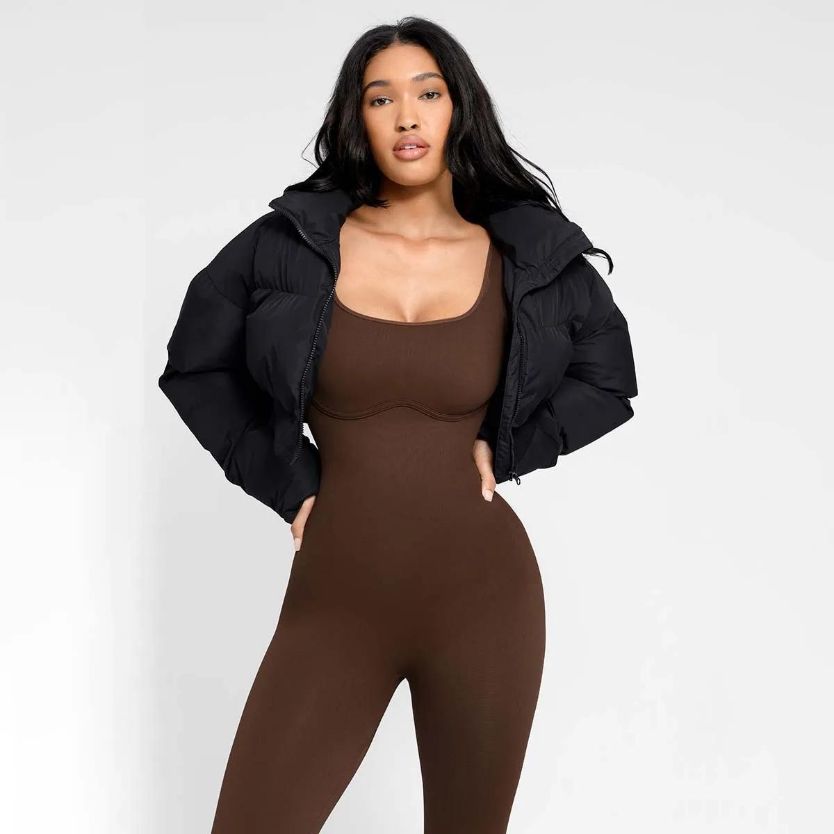 This seamless shapewear yoga set combines comfort and support in a one-piece jumpsuit design. It creates a smooth silhouette, making it perfect for yoga and an active lifestyle.