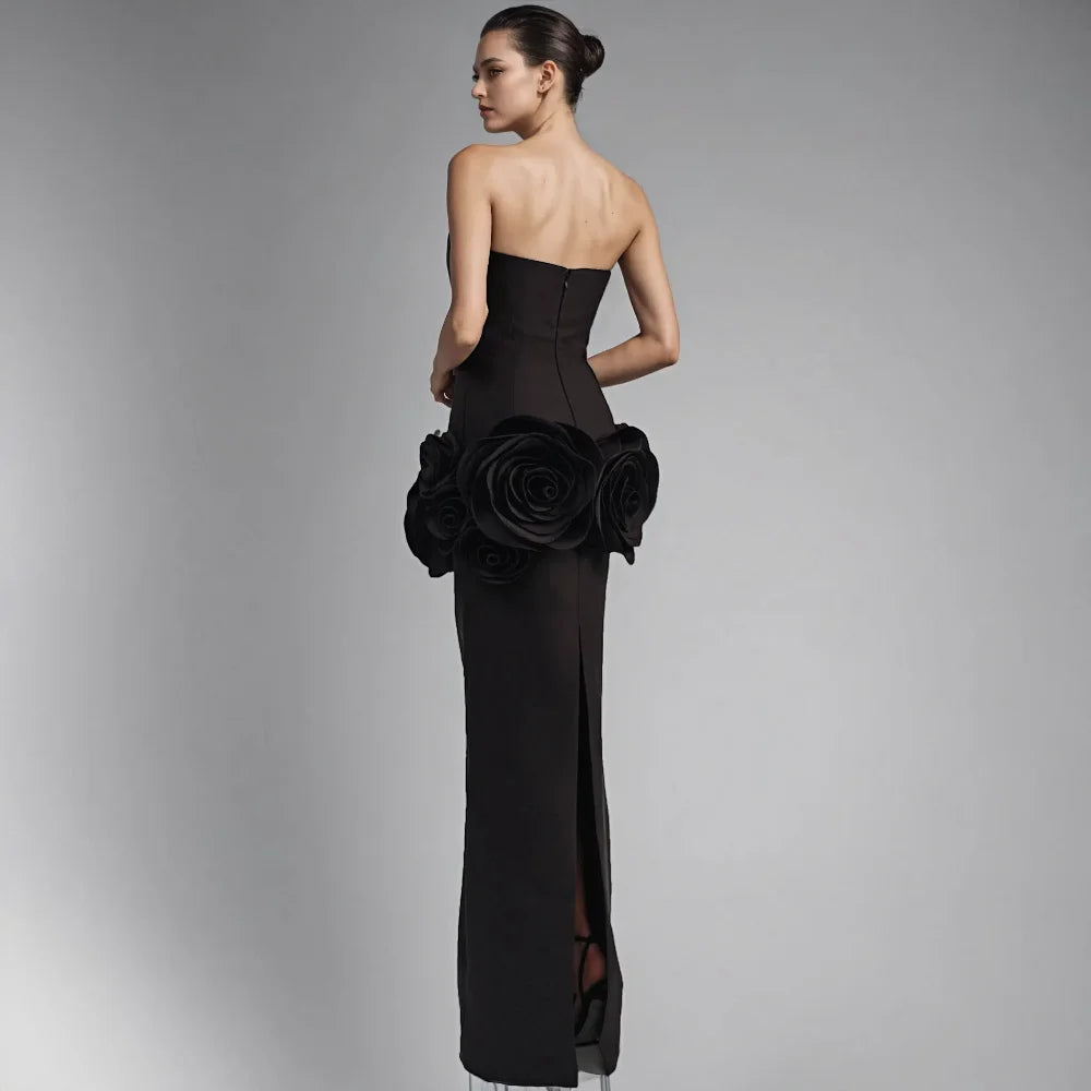 This black maxi dress has 3D flower details and is perfect for special occasions. Its long, flowing design creates a graceful look.