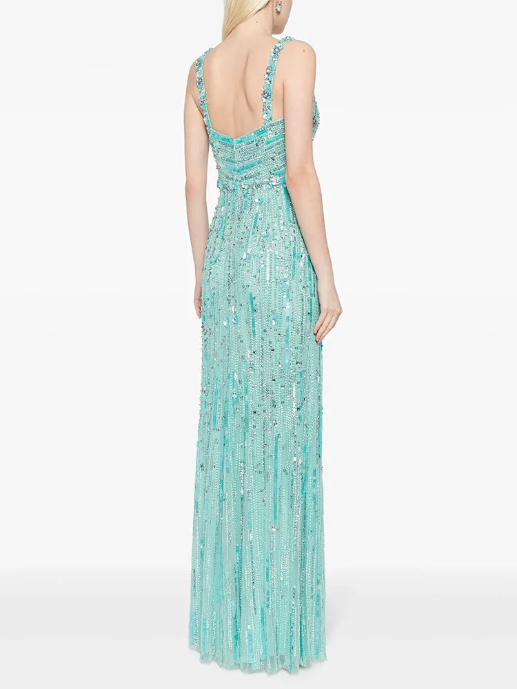 • Mint green beaded evening gown on a white background