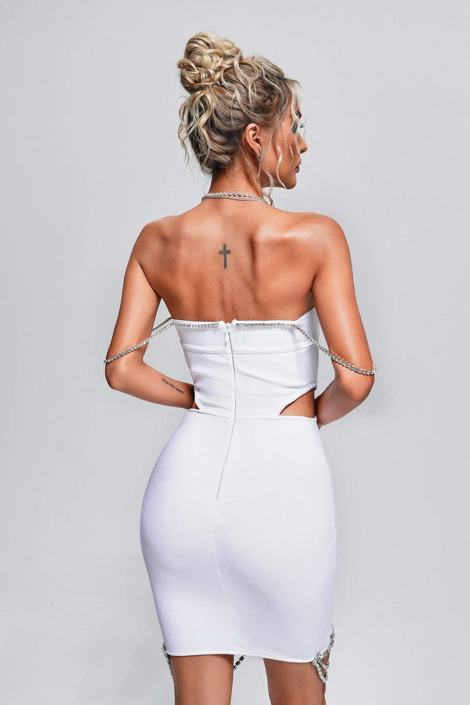 Das schulterfreie Mini-Bandagenkleid „Ezra“ mit Strasssteinen schmeichelt der Figur und betont Ihre Schultern. Die funkelnde Strasskette verleiht ihm einen luxuriösen Touch und macht es zum perfekten Begleiter für jeden Anlass.