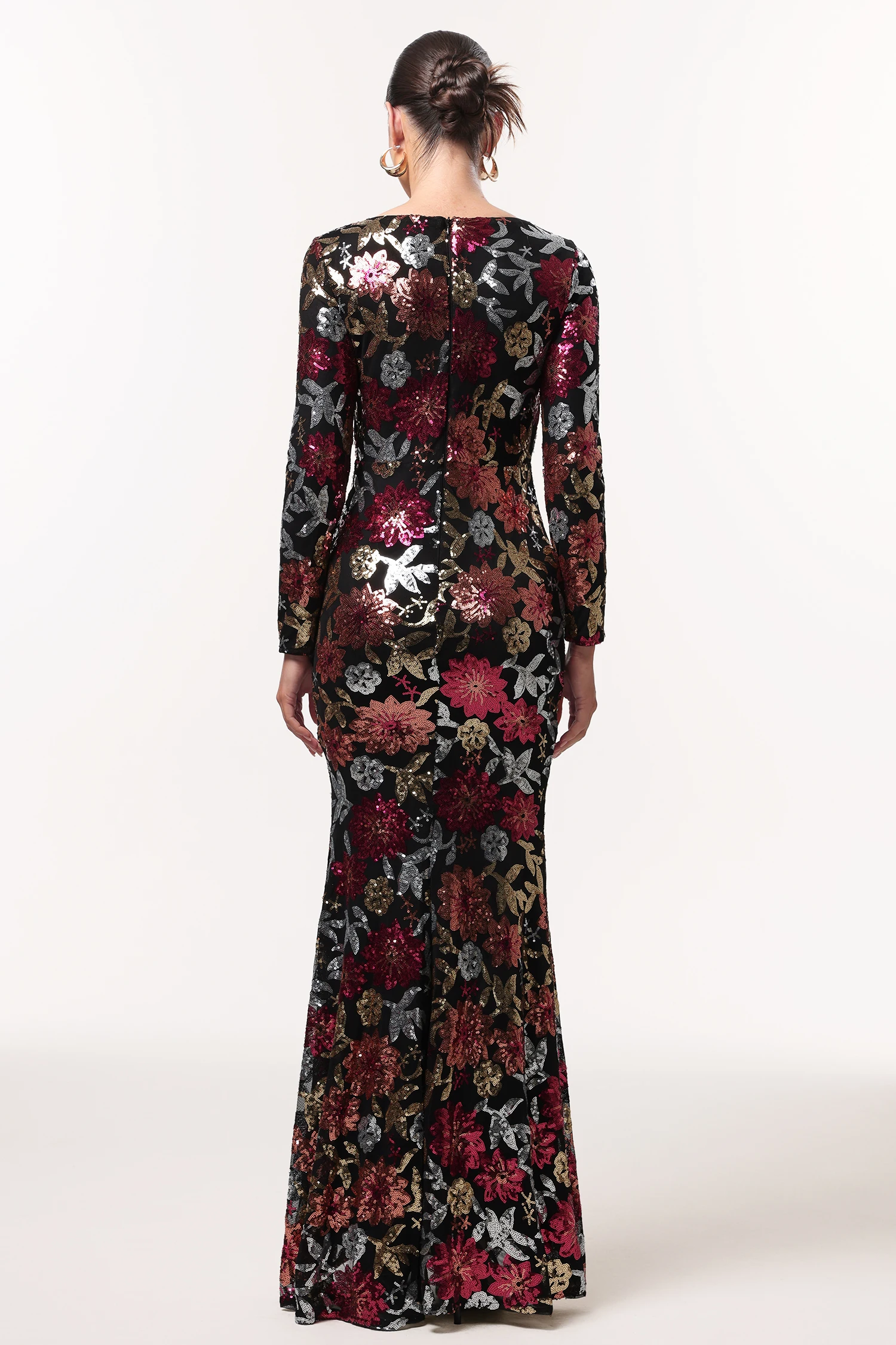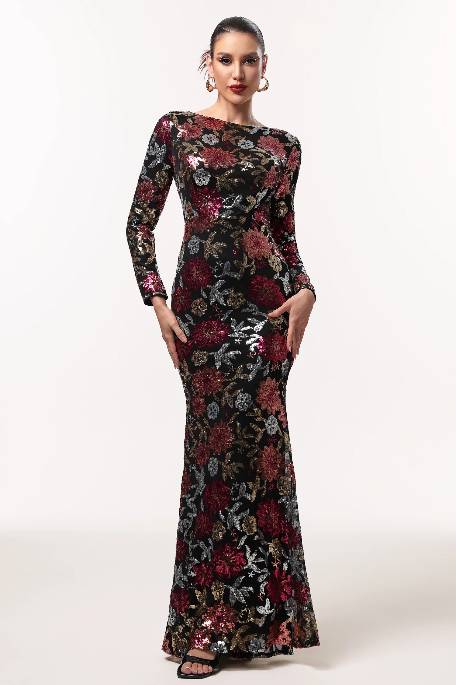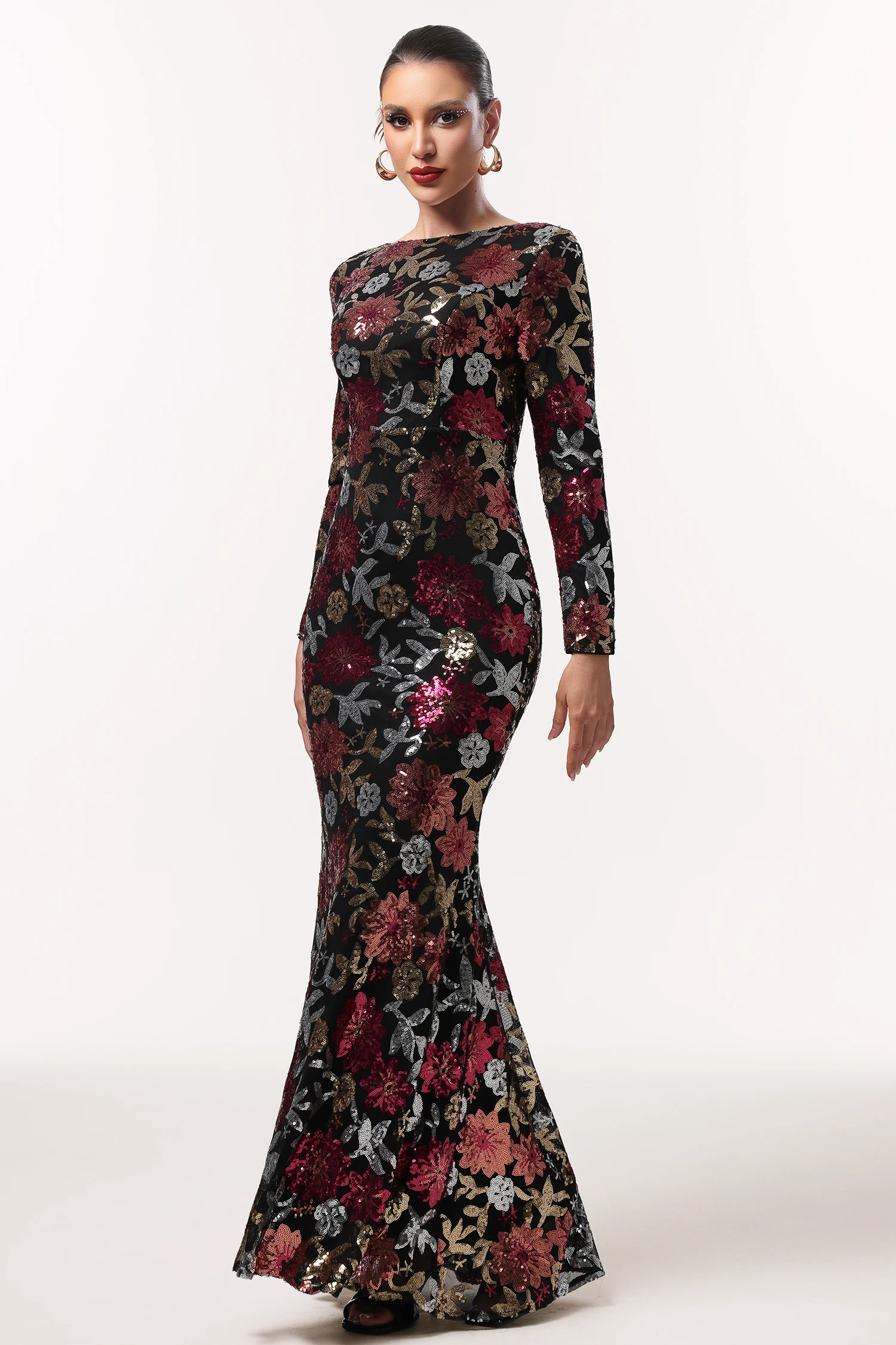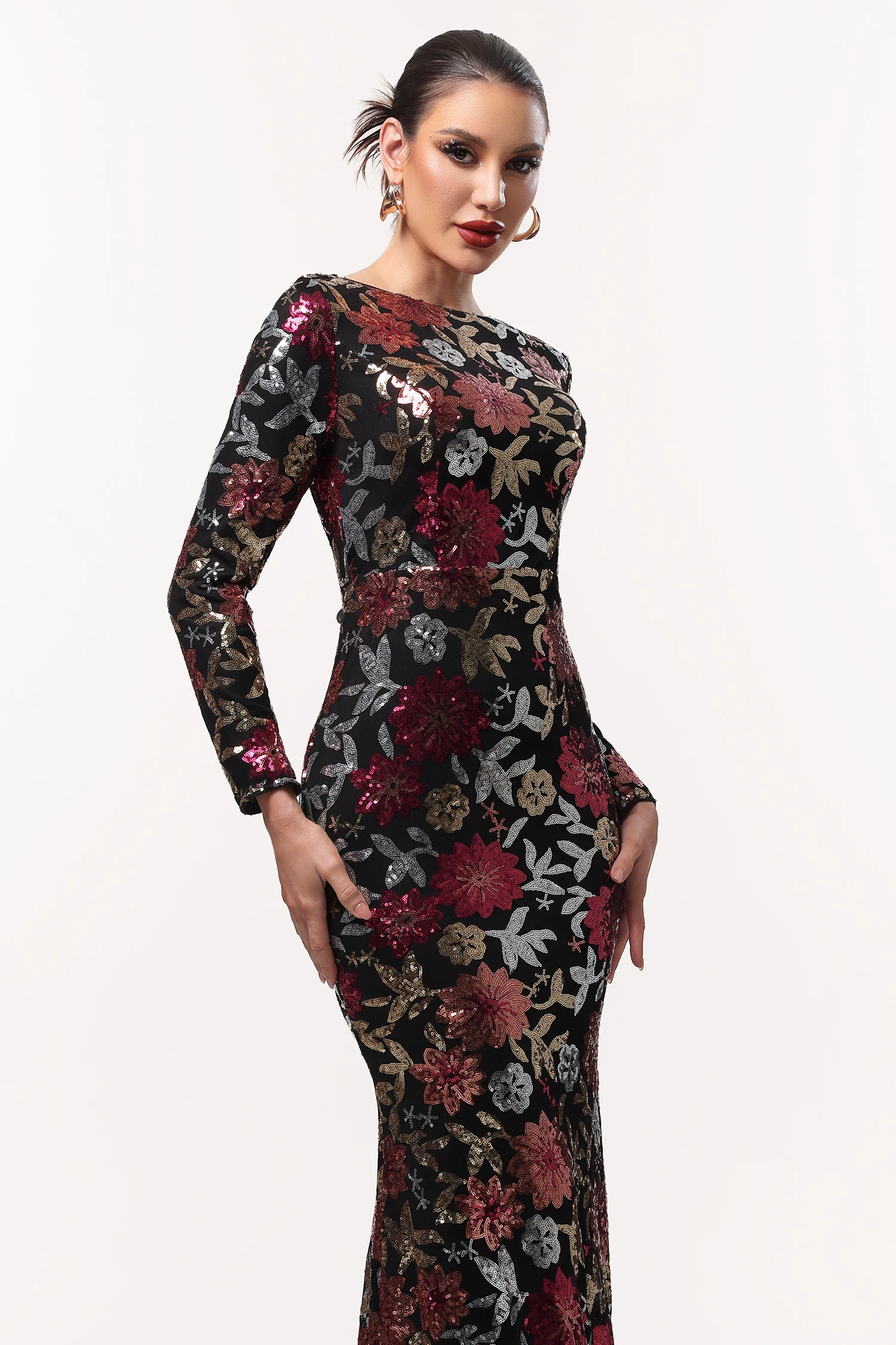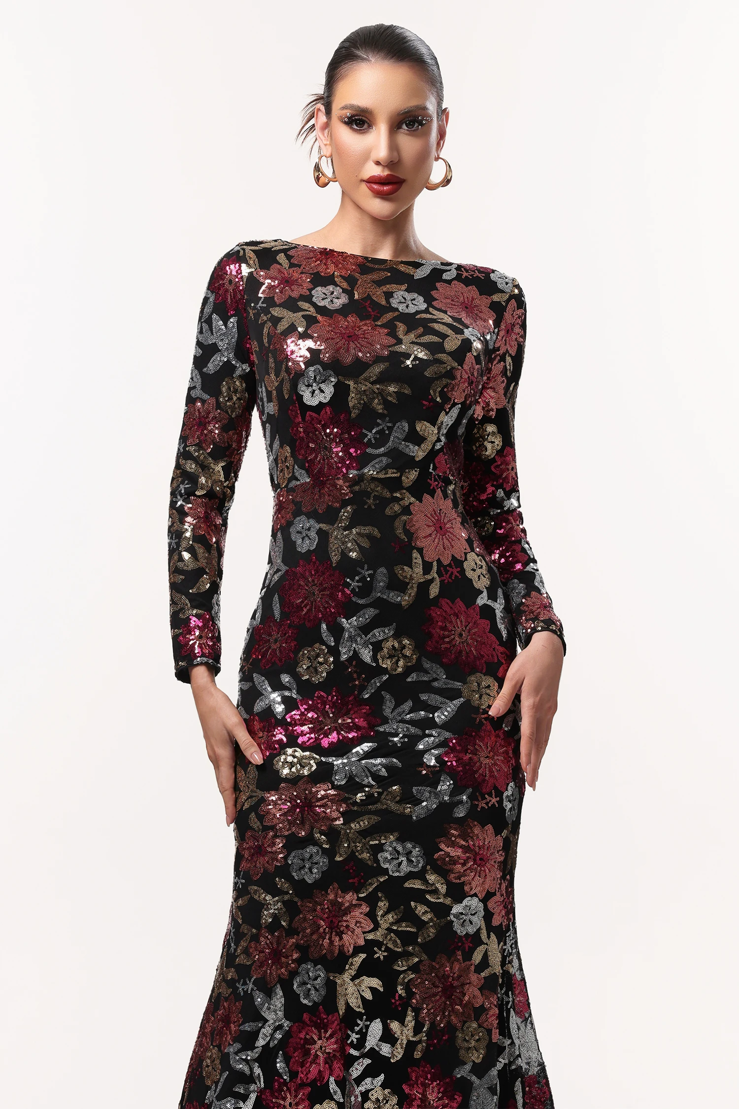 Elegantes, glänzendes Maxikleid von IMaoma mit langen Ärmeln und floralem Webmuster – perfekt für festliche Anlässe wie Geburtstag, Cocktailparty oder Abschlussball.