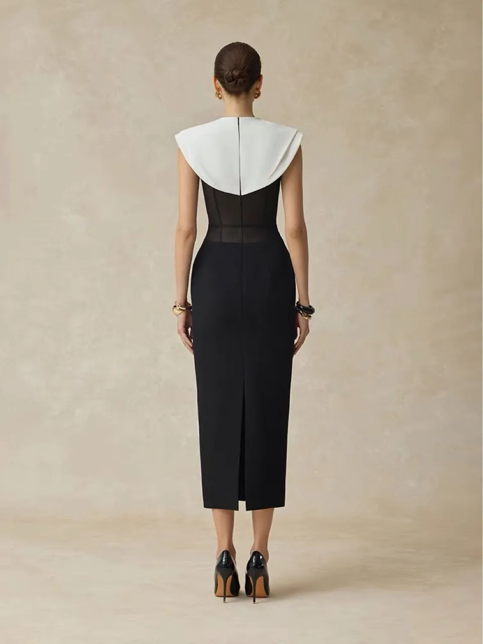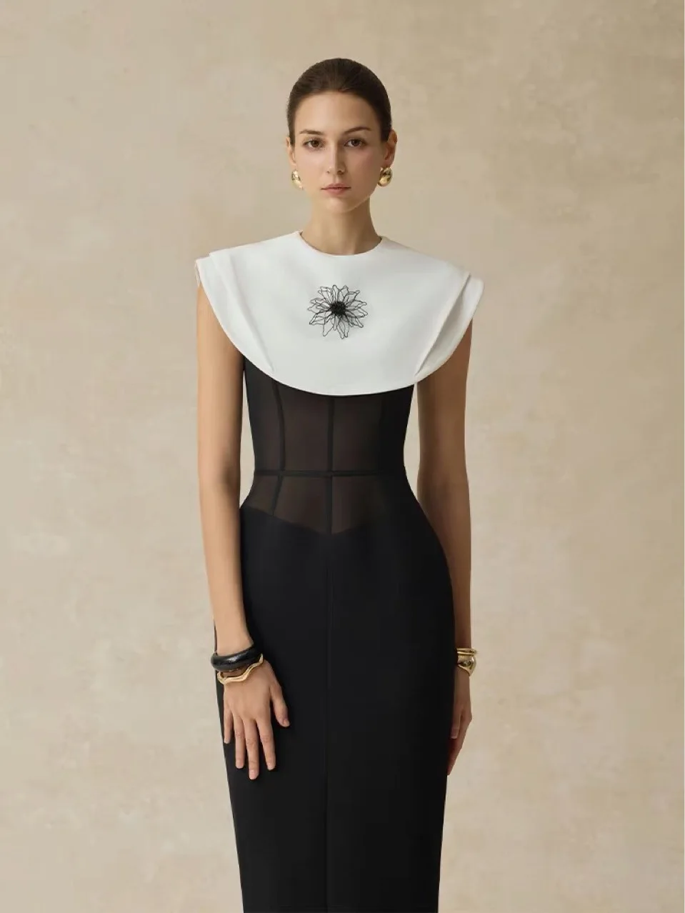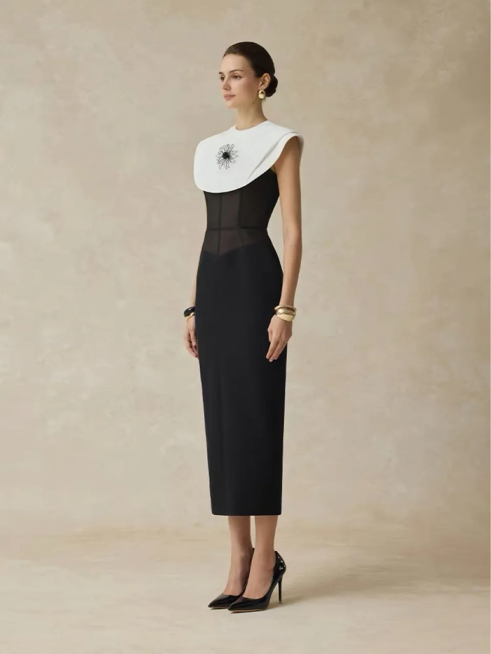 • Robe midi automne-hiver décontractée noire et blanche contrastée, taille cintrée, broderies et volants, coupe crayon naturelle.