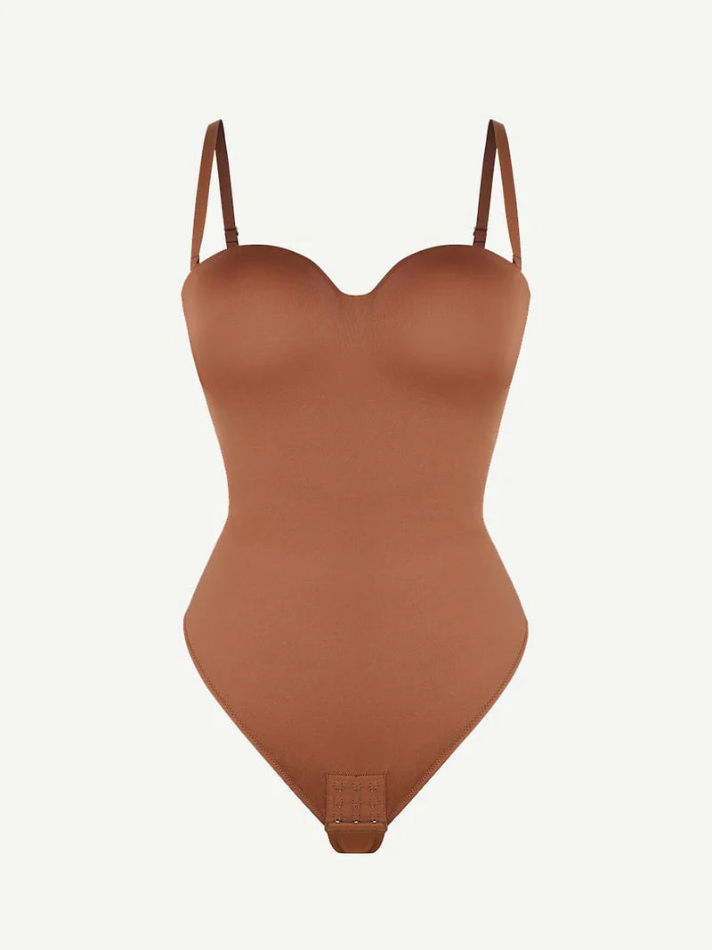 • Woman wearing a beige strapless bodysuit on a white background
