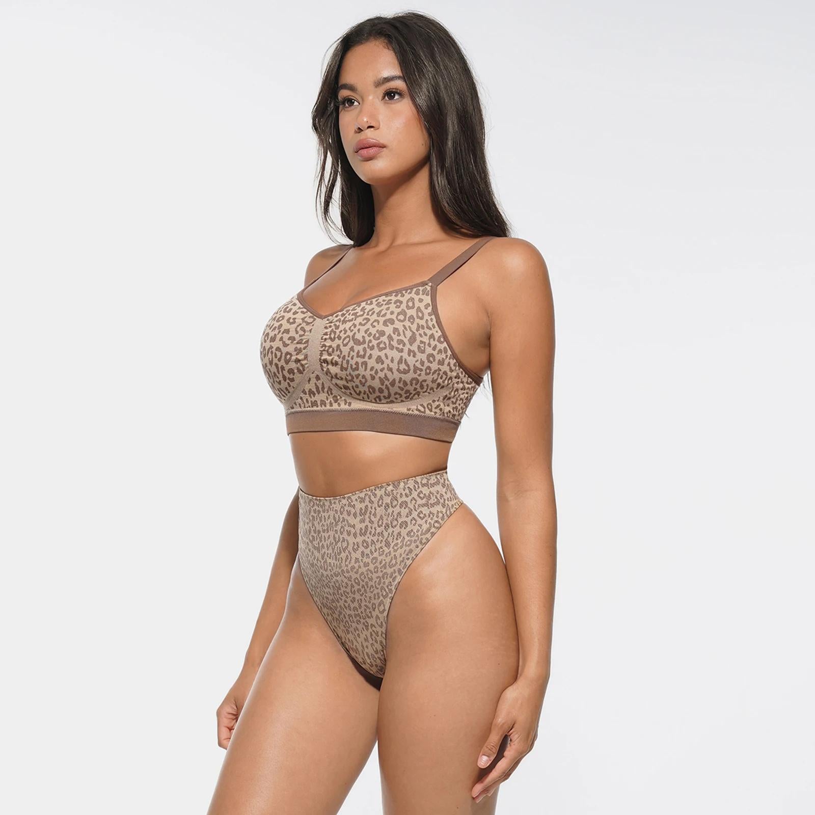Profitez d'un confort optimal tout au long de la journée avec cet ensemble soutien-gorge sans armatures imprimé léopard et culotte taille moyenne assortie. Conçu pour un maintien sans couture, il allie style et praticité.