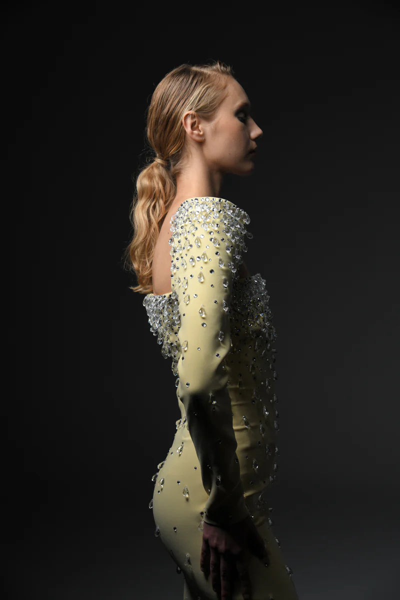 The Magdalena Maxi Dress features a luxurious beaded square neckline and dramatic full-length leg of mutton sleeves. Its sleek sheath silhouette makes it perfect for high-end events where you want to stand out in style.